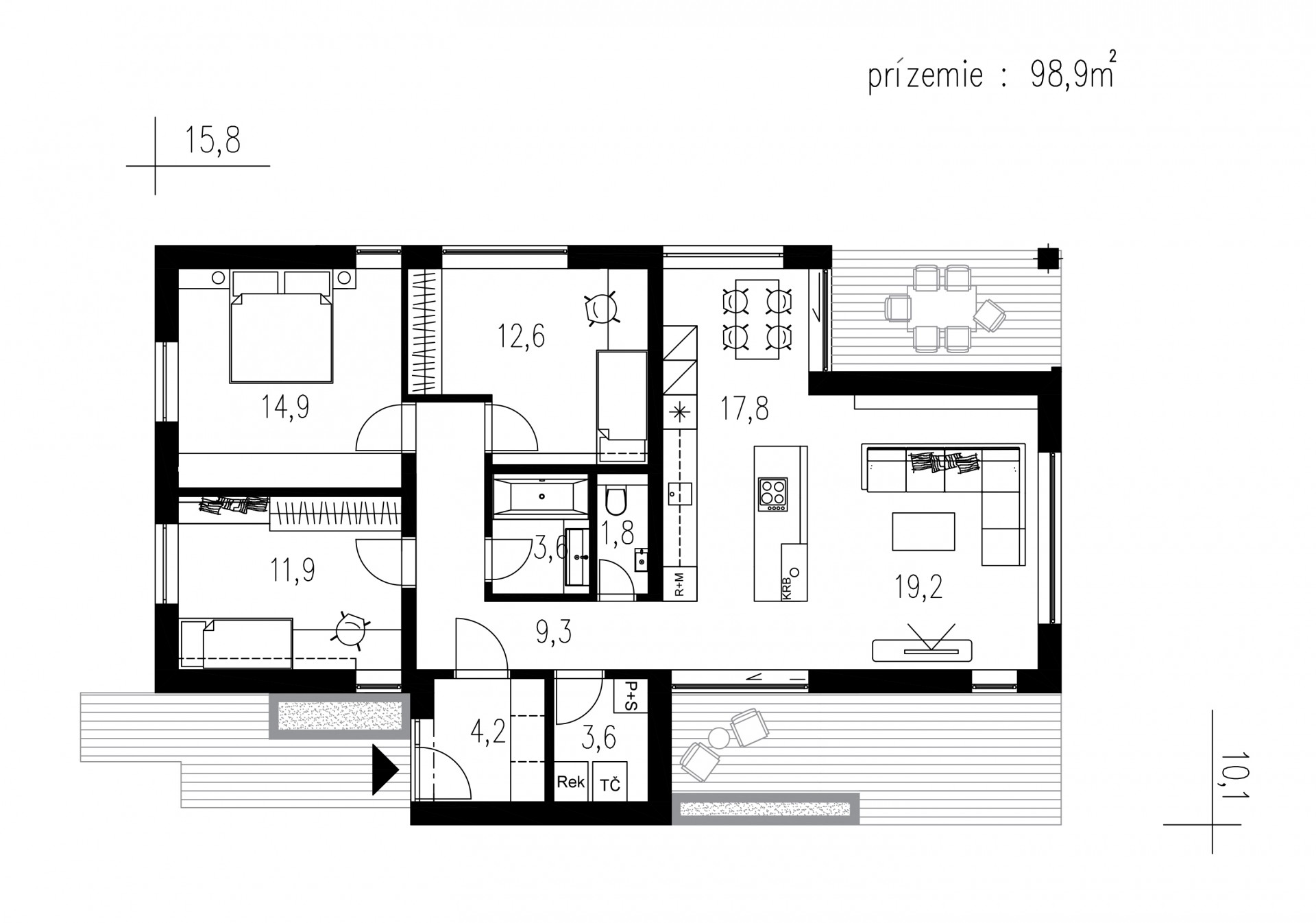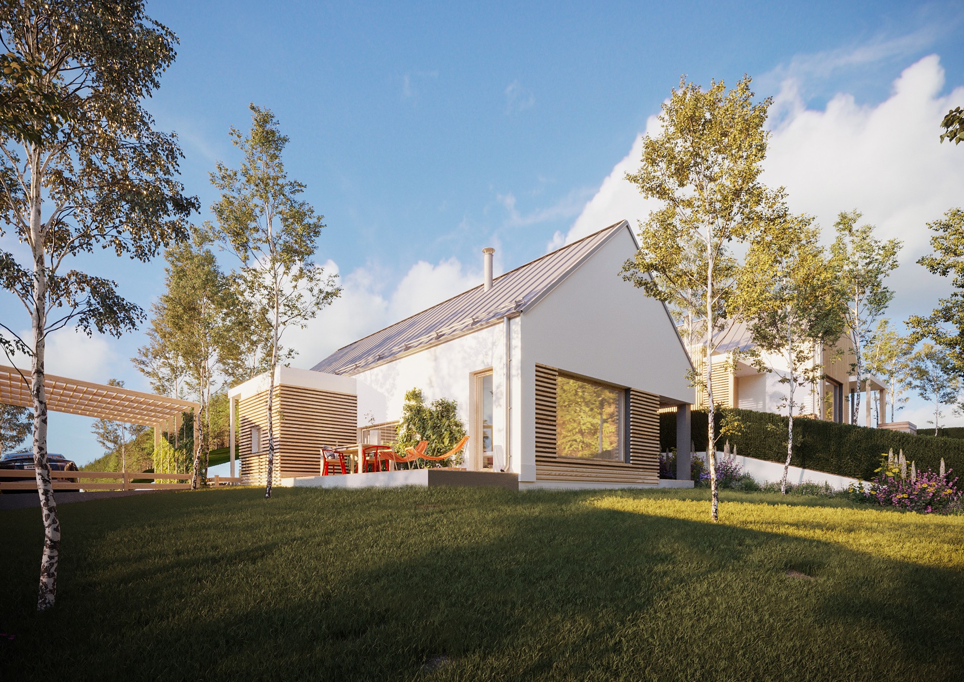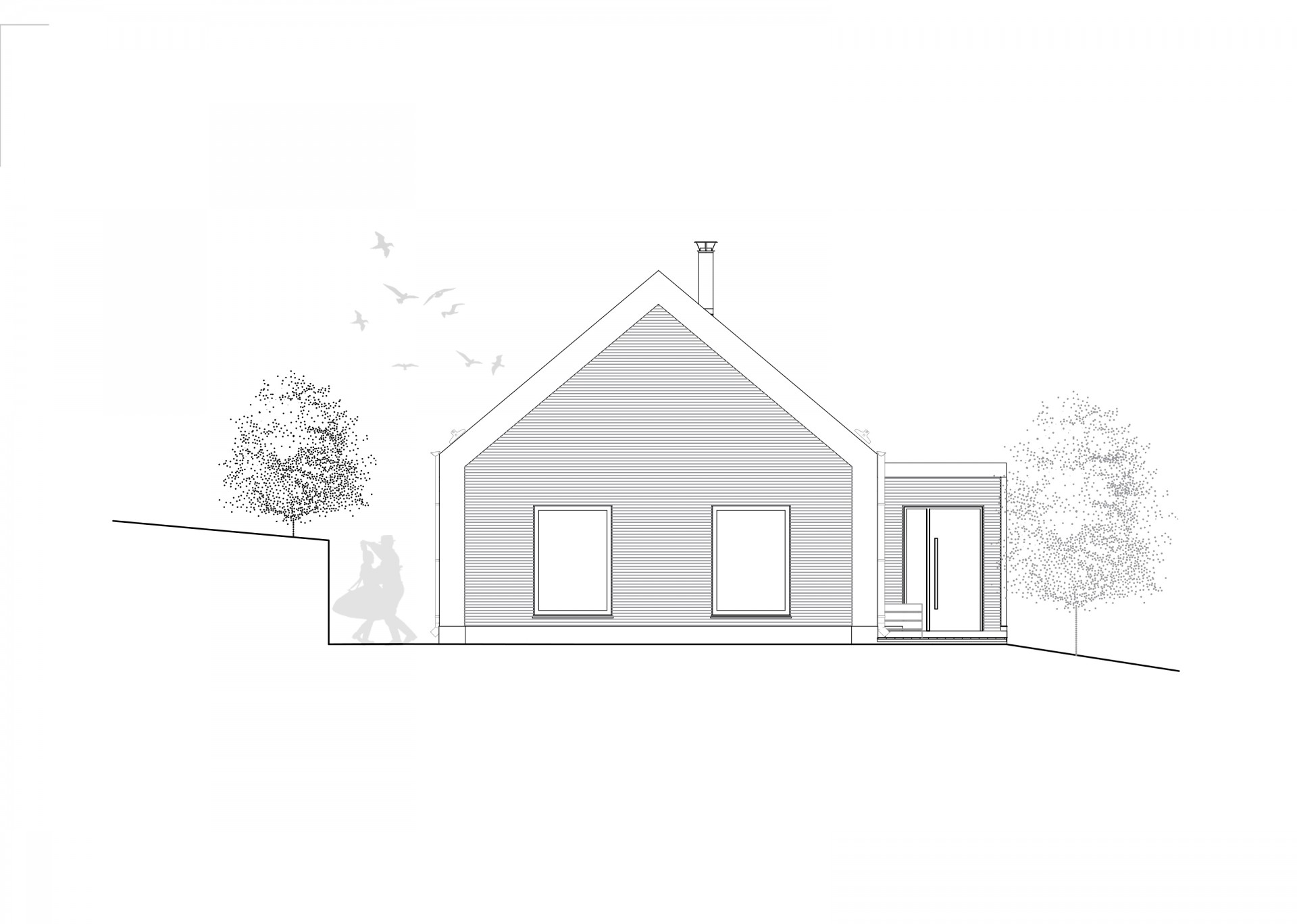 Dom "Ani veľký ani malý" je určený pre 4 člennú rodinu. Vstupná chodba dispozíciu rozdeľuje na nočnú a dennú zónu. Každá izba v dome je bohate presvetlená a komunikuje tak s exteriérom. Jemná členitosť hmoty vytvára tzv. "Outdoor room" na terasách , kde počas letného alebo prechodného obdobia viete vytvoriť záhradnú jedáleň alebo letnú kuchyňu, stačí pridať pracovný pult a gril :) .