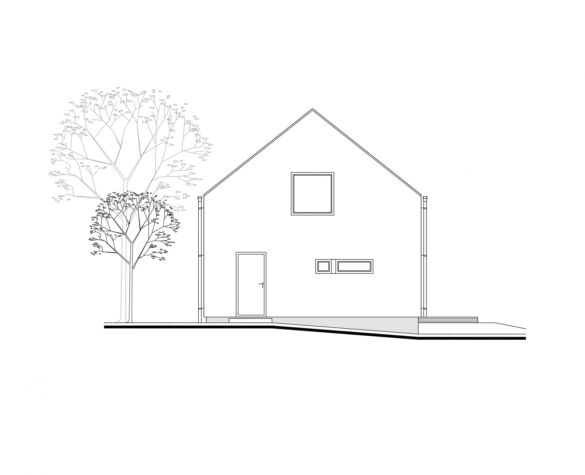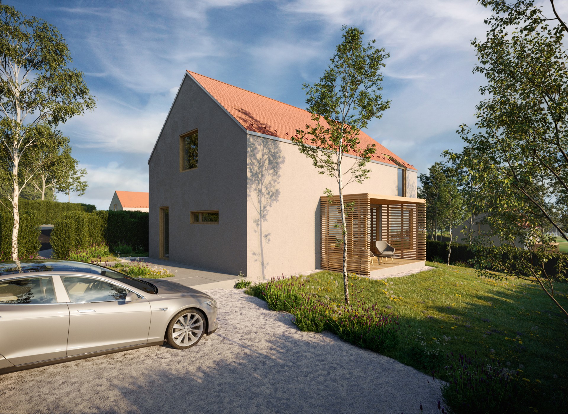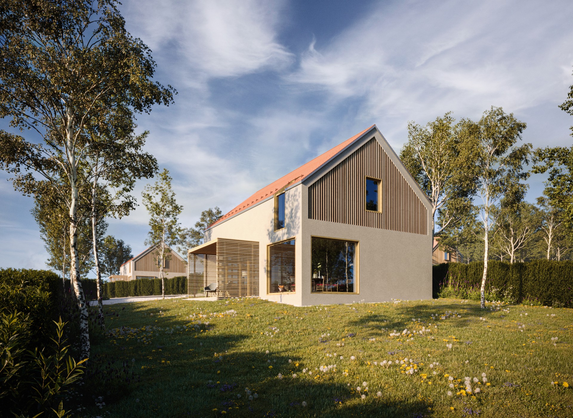 Jednoduchý a predsa špecifický dom zaujme čistým architektonickým riešením. Najvýraznenším prvkom fasády je citlivo umiestnený drevený raster v hornej časti domu od záhrady, ktorý evokuje aj vďaka pocitu plasticity prevažnej časti fasády, tradičnú architektúru. Flexibilnosť dispozície prízemia umožňuje vytvoriť otvorený priestor dennej časti alebo uzavrieť kuchyňu s jedálňou ako samostatný priestor. Obývacia izba s napojením na terasu poskytuje úzky kontakt užívateľa so zeleňou. Zaujímavé premostenie medzi nočnými izbami na poschodí dodáva interiéru vertikálnu vzdušnosť, optické prepojenie medzi podlažiami a sekundárne presvetlenie týchto priestorov z prízemia. Tento premosťovací prvok môže slúžiť ako herňa, pracovňa alebo čitáreň. Nočné izby sa navzájom nerušia a využívajú spoločnú kúpeľňu.