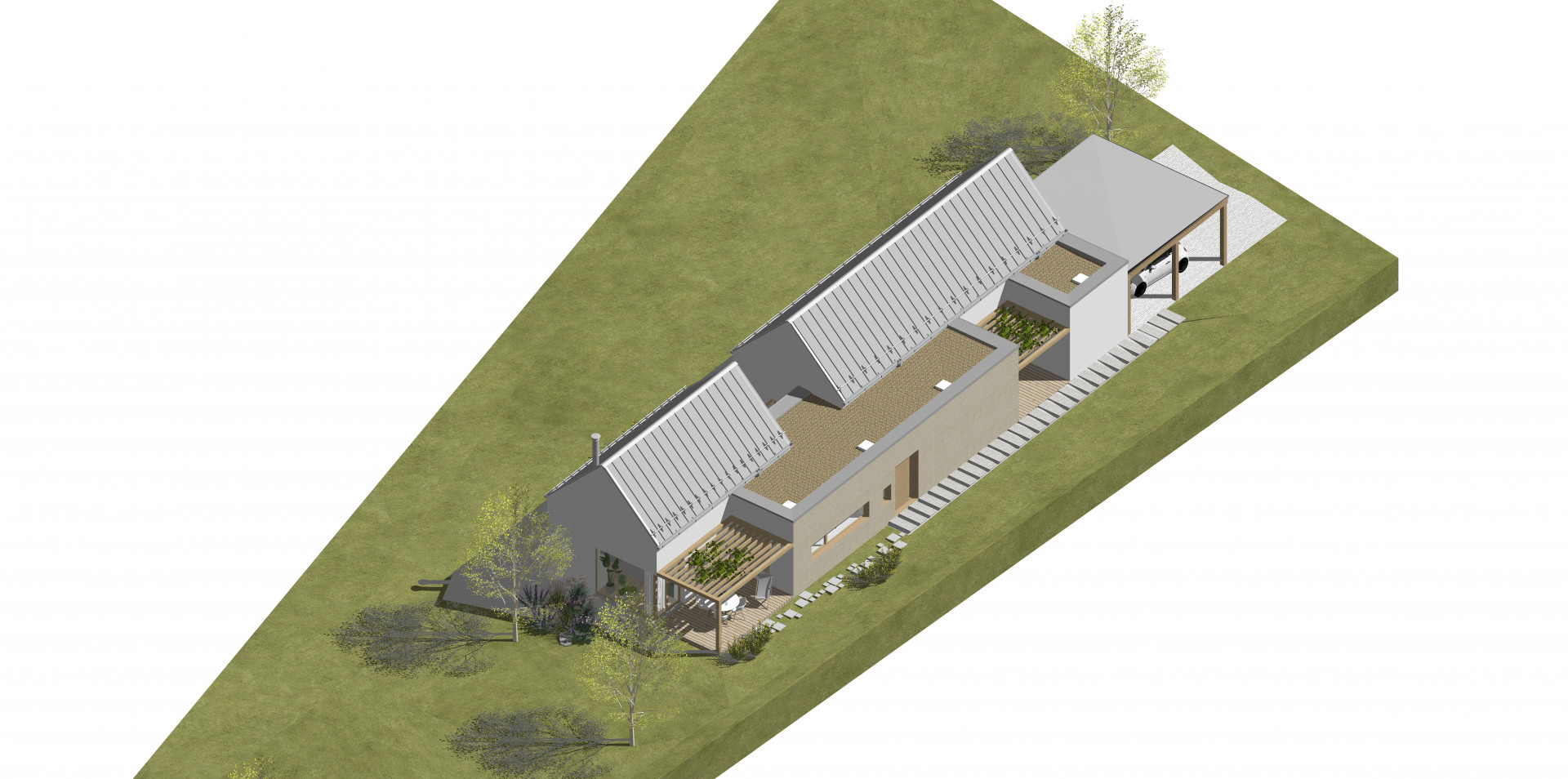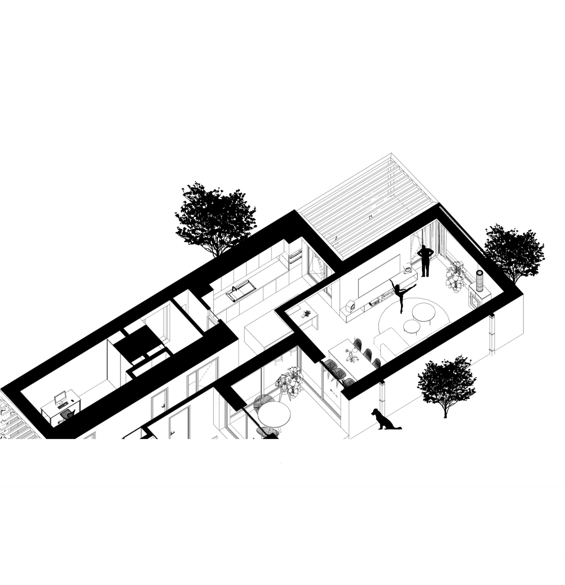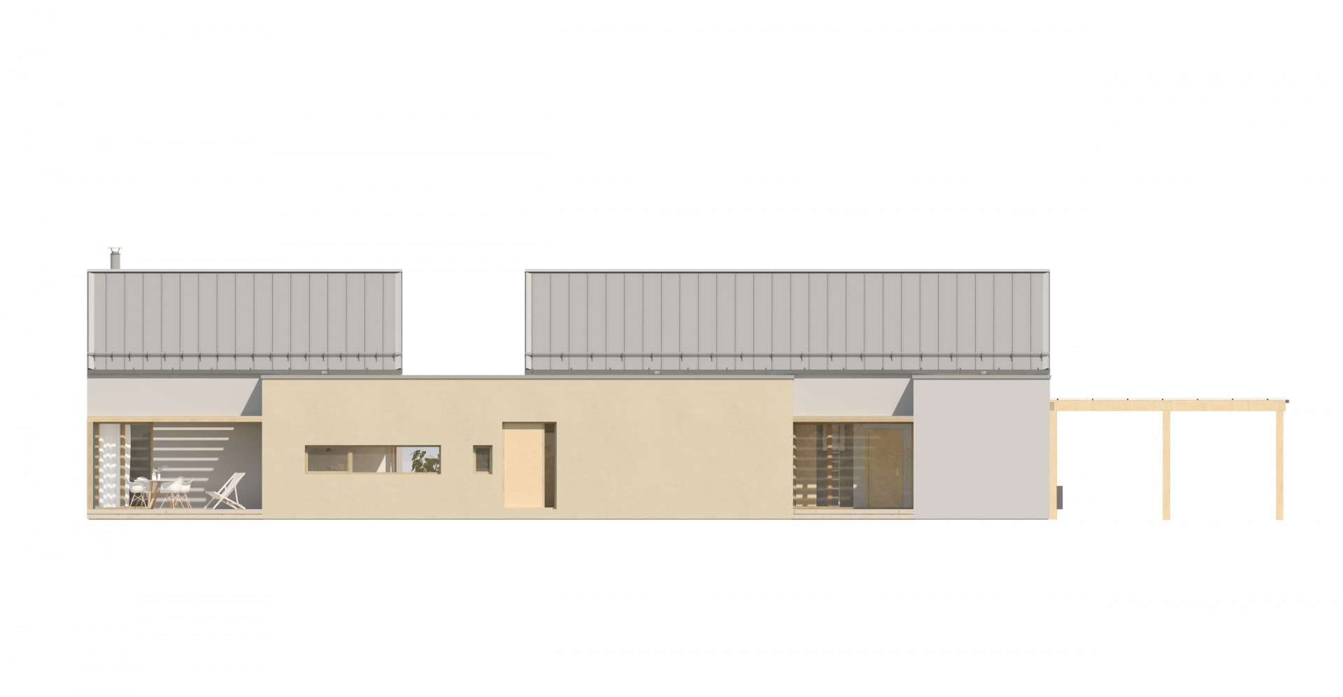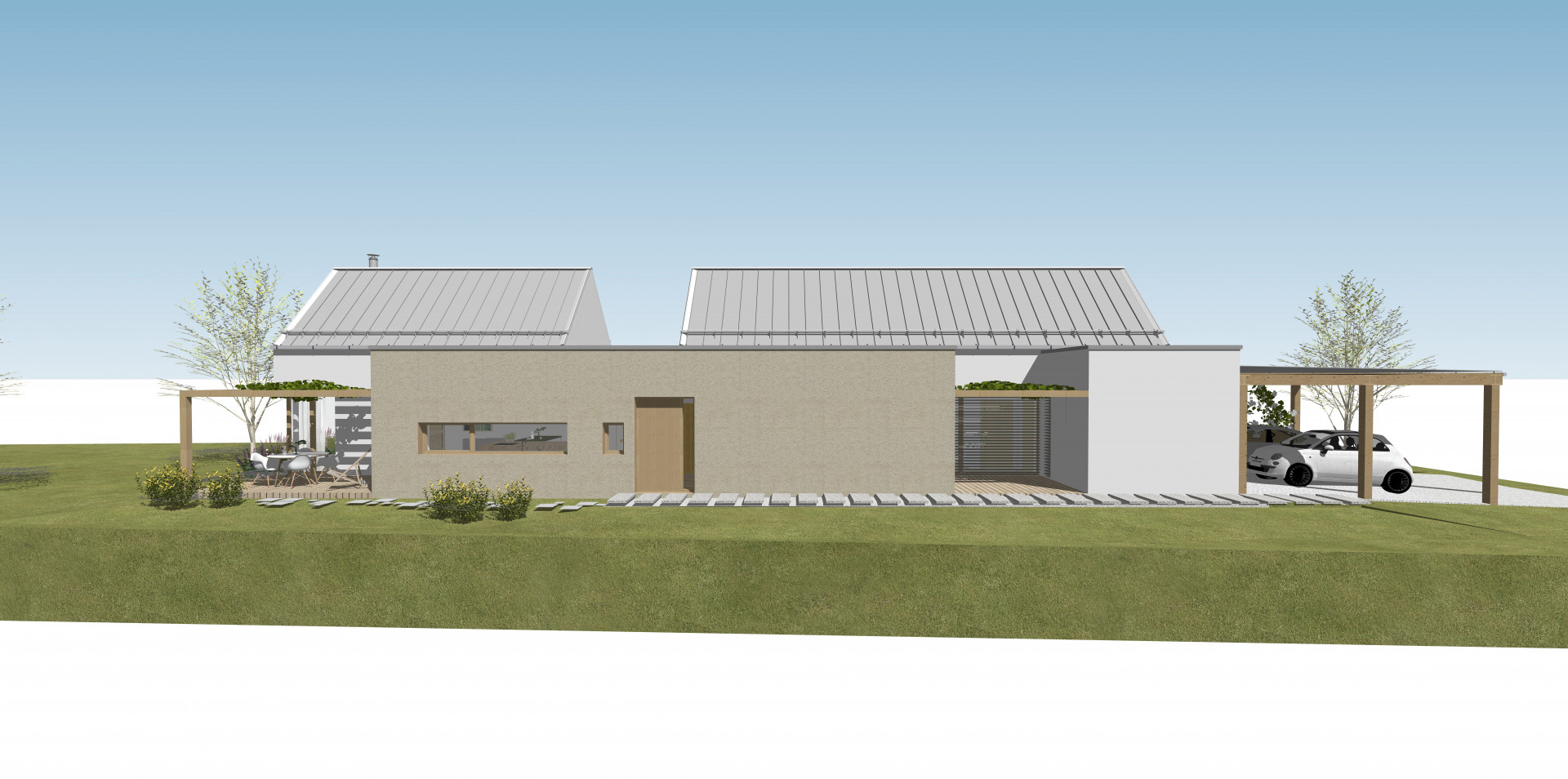 Dom vďaka svojmu átriovému riešeniu je vhodný na úzke pozemky rešpektujúc susedné domy. Strecha je riešená ako kombinácia striech - plochej a sedlovej, preto je možné dom osadiť do modernej aj tradičnejšej zástavby. Dispozícia domu ponúka množstvo svetla, intimity, zaujímavých priehľadov a zákutí pre užívateľa. Dom sa veľkorysými oknami doslova prepája s prírodou. Terasy je možné využiť pre záhradné aktivity alebo súkromný oddych, ktorý ponúkajú átriá. Výhodou riešenia sú dva možné vstupy do domu, ktoré riešia flexibilne dlhšiu dispozíciu. Hlavná obývačková zóna ponúka otvorený vzdušný priestor, ktorý si určite zamilujete. :)