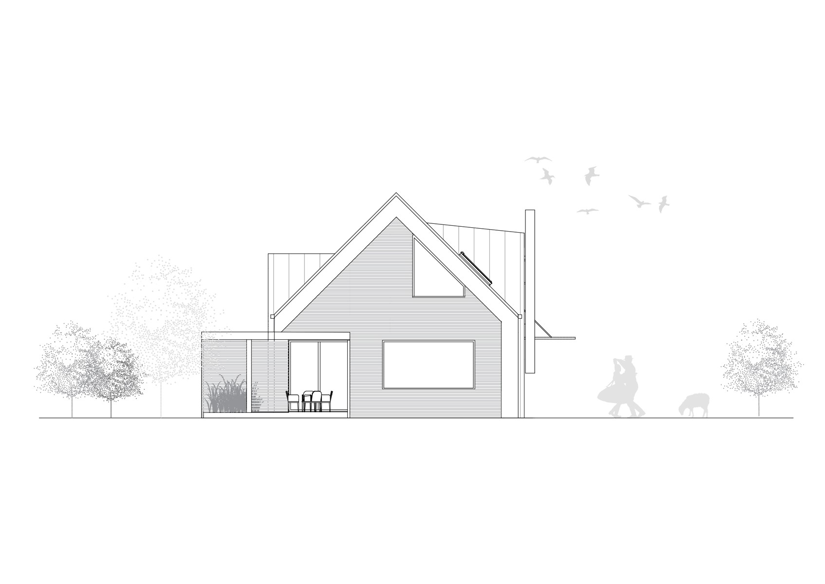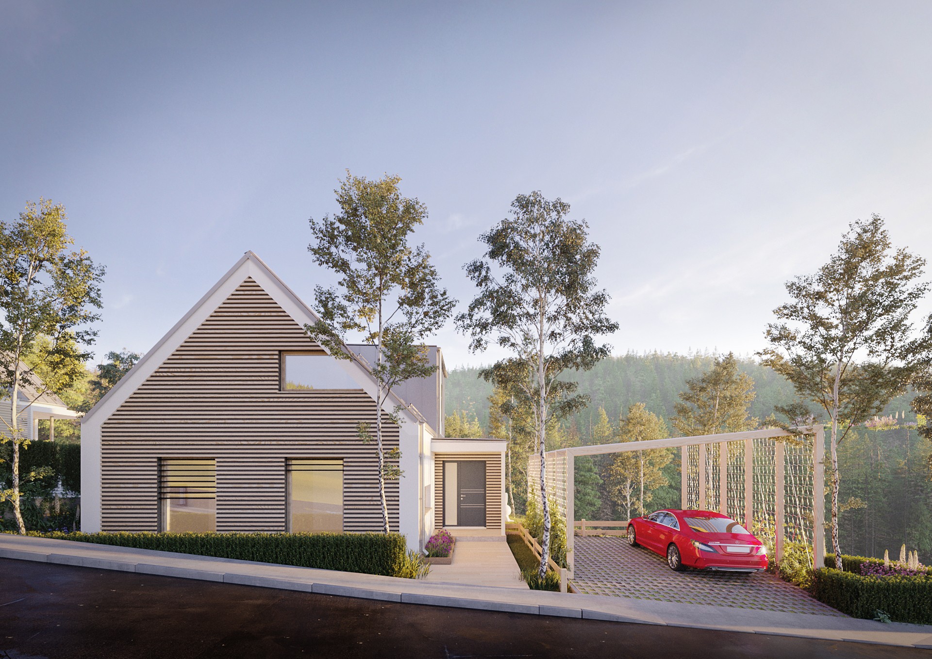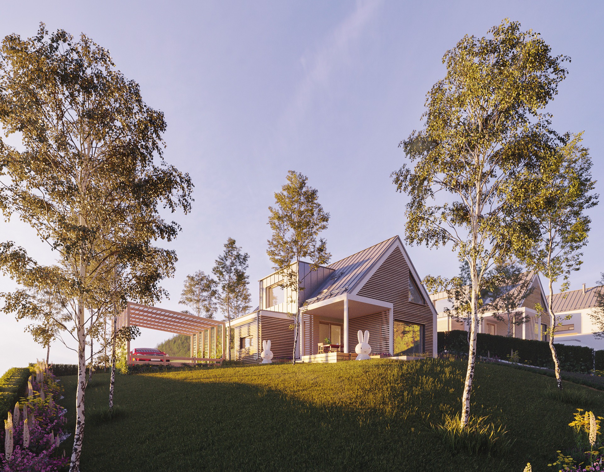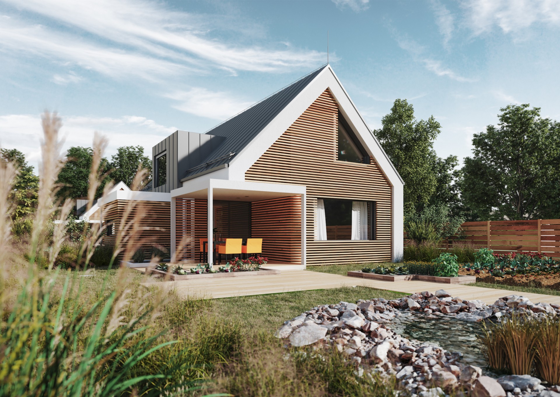Dom v znení zaliaty slnkom, plný radosti a dobrej energie, so sedlovou strechou a drevenými prvkami, ktoré tvoria prevažnú časť fasády. Dispozícia domu sa otvára k exteriéru zo všetkých strán a tým za pomoci veľkých okenných otvorov maximálne komunikuje s prírodou. Izby sú väčšie, určené pre viac ľudí a tým sa dom snaží prehlbovať rodinné vzťahy :)