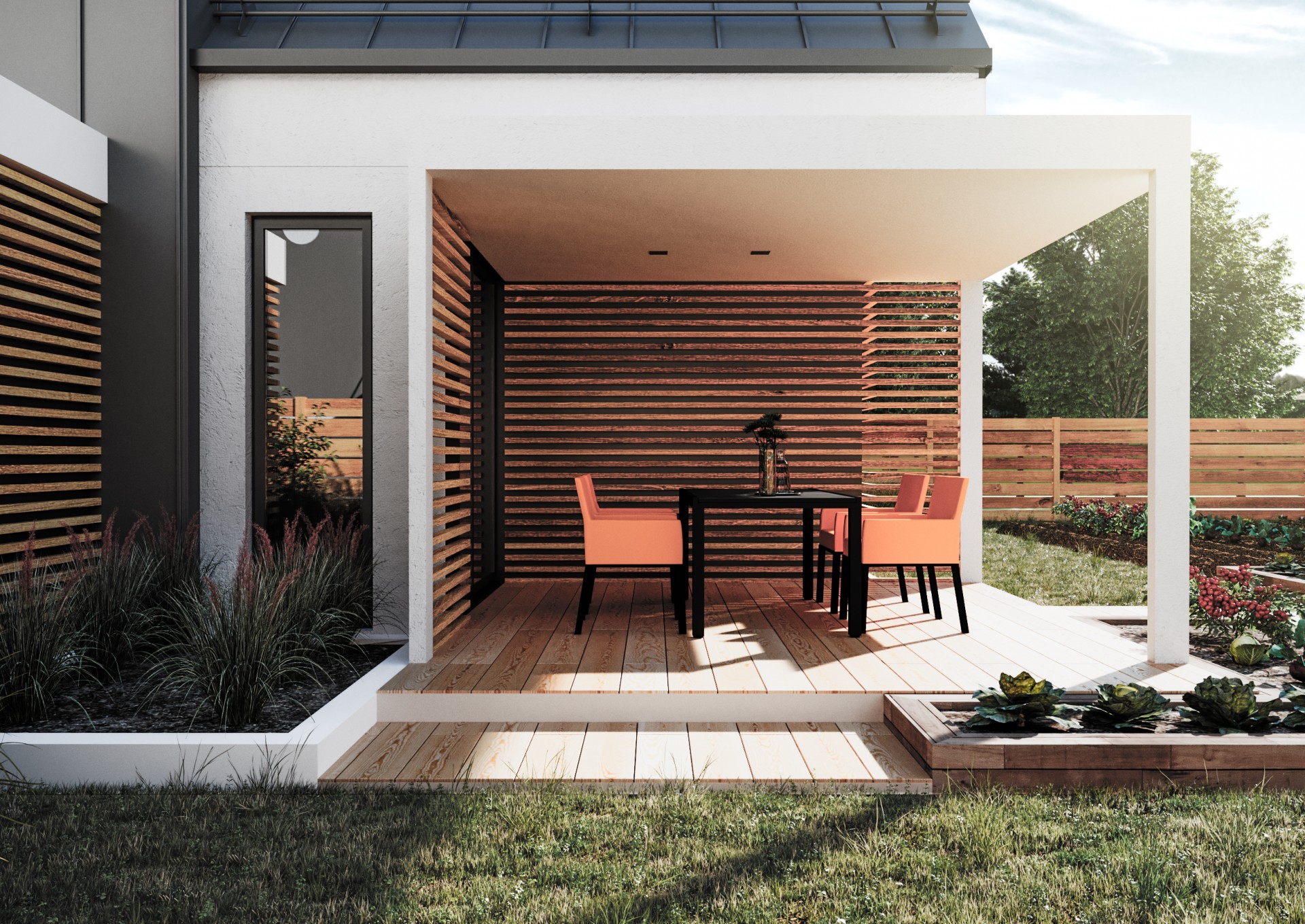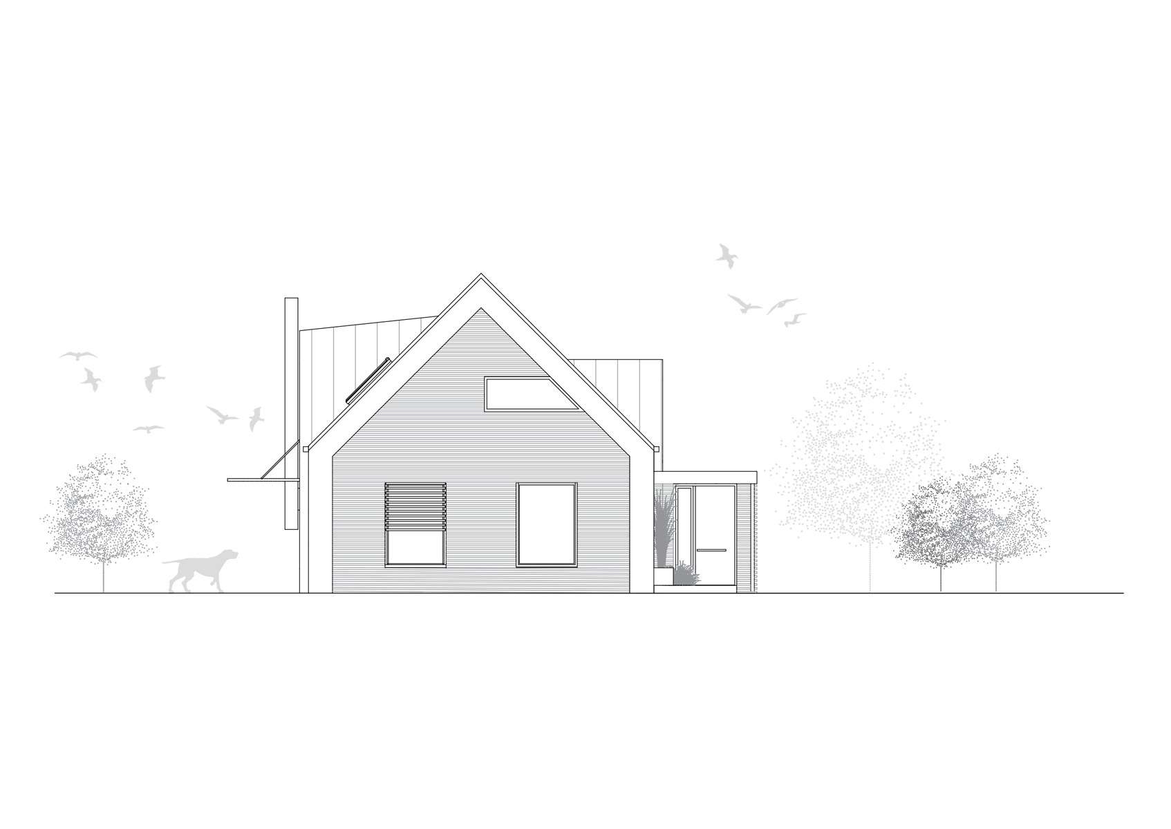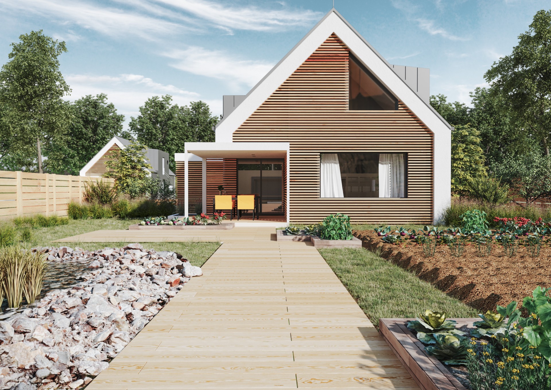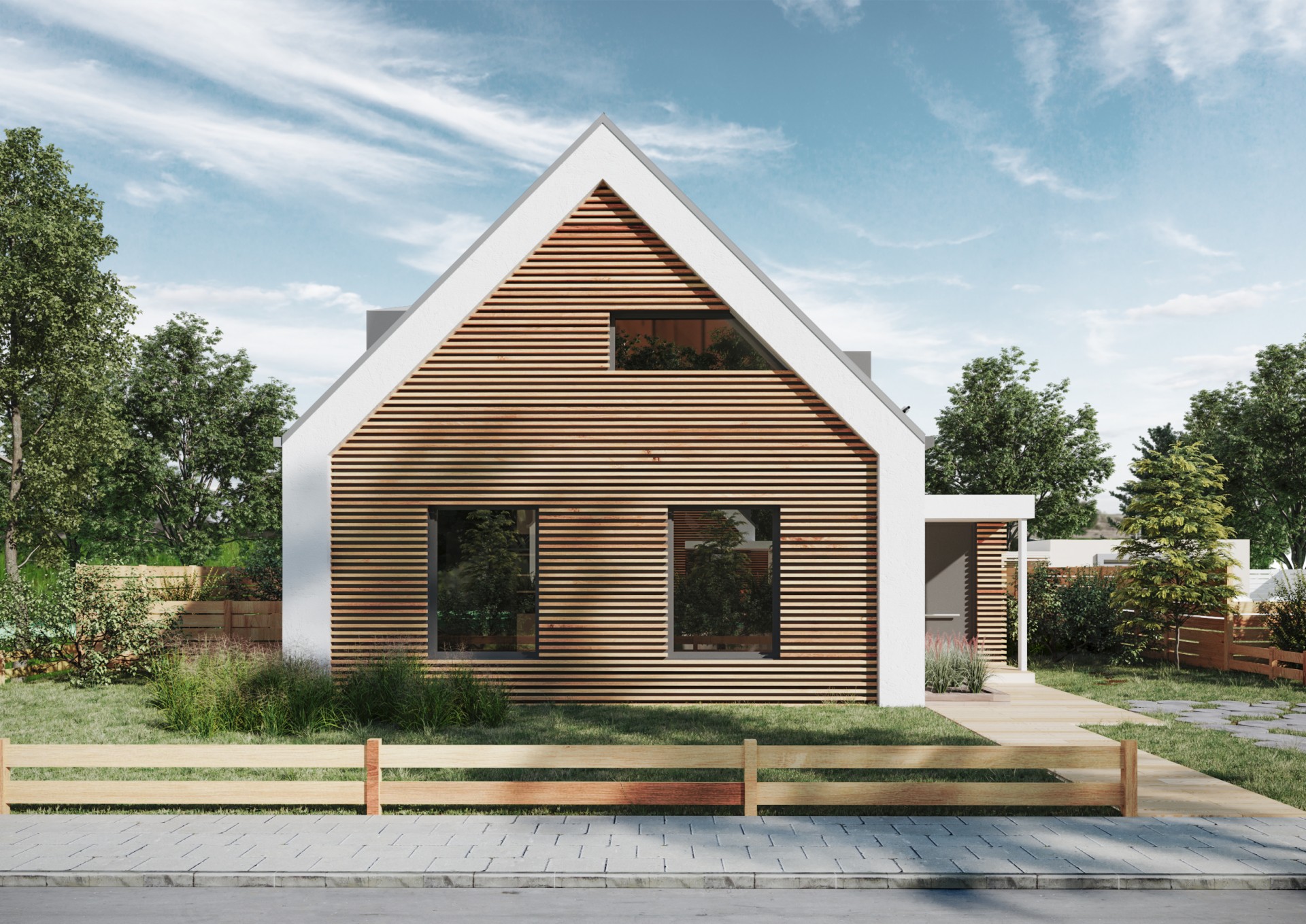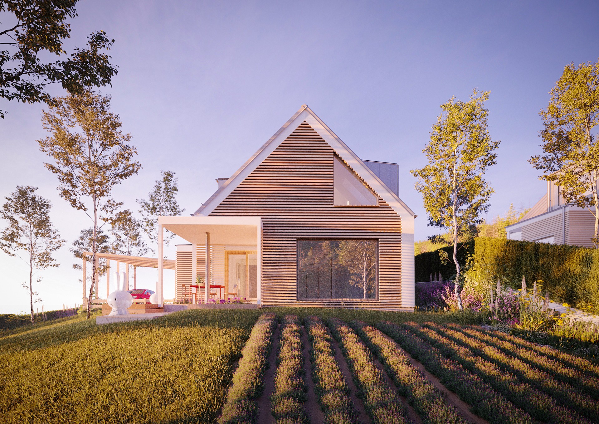 Dom v znení zaliaty slnkom, plný radosti a dobrej energie, so sedlovou strechou a drevenými prvkami, ktoré tvoria prevažnú časť fasády. Dispozícia domu sa otvára k exteriéru zo všetkých strán a tým za pomoci veľkých okenných otvorov maximálne komunikuje s prírodou. Izby sú väčšie, určené pre viac ľudí a tým sa dom snaží prehlbovať rodinné vzťahy :)
